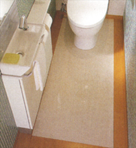 | 便器まわりに大形セラミックパネルとフローリングを組合せてセットにしたトイレ床材。サッとひとふきカンタンお手入れでイヤなにおいも抑えます。 |